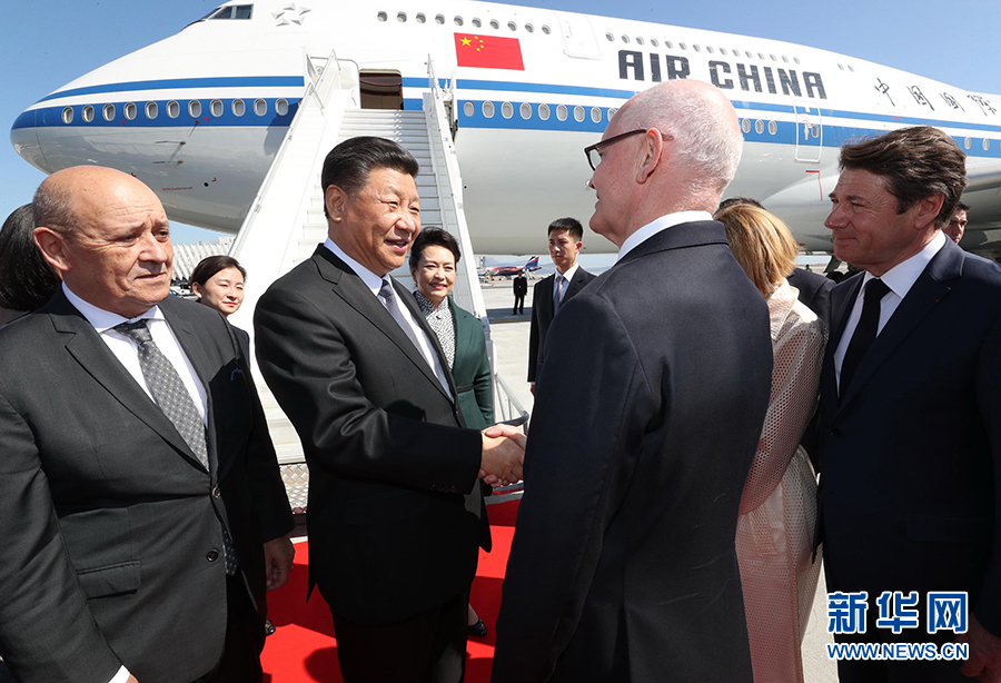 当地时间中午12时许,习近平乘坐的专机抵达尼斯机场。习近平和夫人彭丽媛受到摩纳哥政府首脑、国务大臣泰尔,摩纳哥对外关系与合作大臣托内利热情迎接。法国外长勒德里昂也到机场迎接。习近平和彭丽媛沿红地毯前行,礼兵分列红地毯两侧,行注目礼。