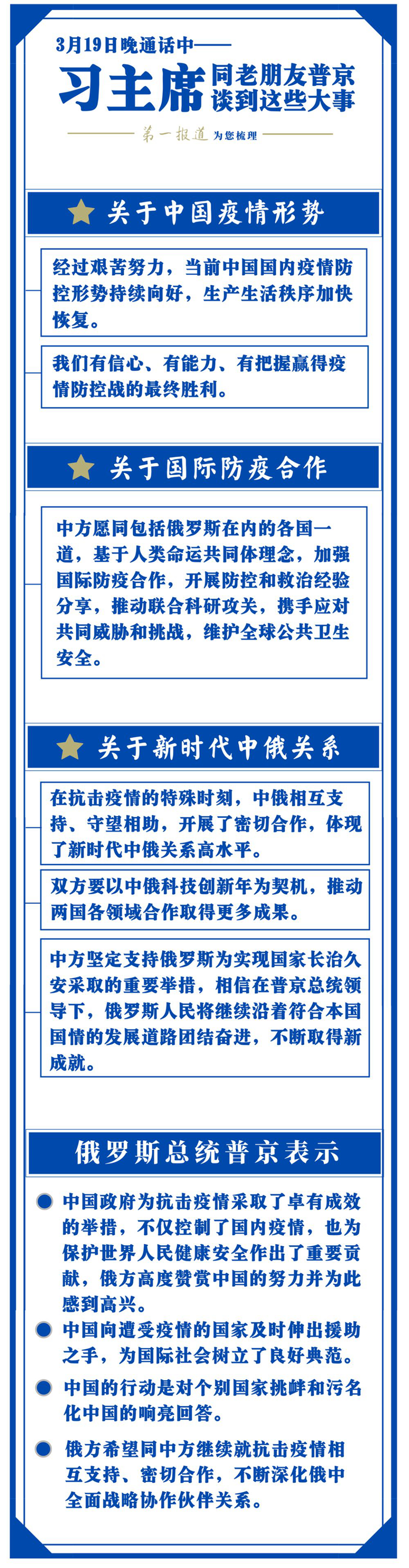 这次中俄元首通话,信息量很大。习主席主要讲了三方面的事:关于中国疫情形势,关于国际防疫合作,关于新时代中俄关系。具体内容,“第一报道”为您梳理: