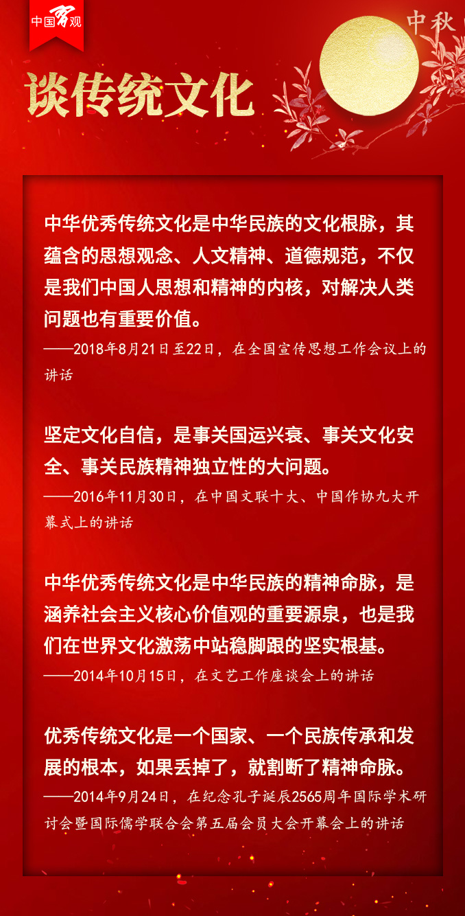 又是一年中秋时!节庆是中国传统文化的重要载体,同时也是中华优秀传统与传统文化的重要组成部分。中秋节是中国传统节日之一,承载着国人对团圆和睦的美好追求、中华民族的传统美德、民族情感和思想精华。习近平总书记对中华传统节日和中华传统文化十分重视,多次强调中华优秀传统文化的宝贵价值和独特作用。在中秋节到来之际,《中国习观》带你一起回顾习近平总书记的这些话。