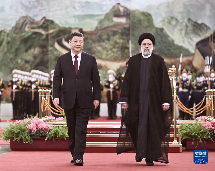 2月14日,国家主席习近平在北京人民大会堂同来华进行国事访问的伊朗总统莱希举行会谈。这是会谈前,习近平在人民大会堂北大厅为莱希举行欢迎仪式。新华社记者 燕雁 摄