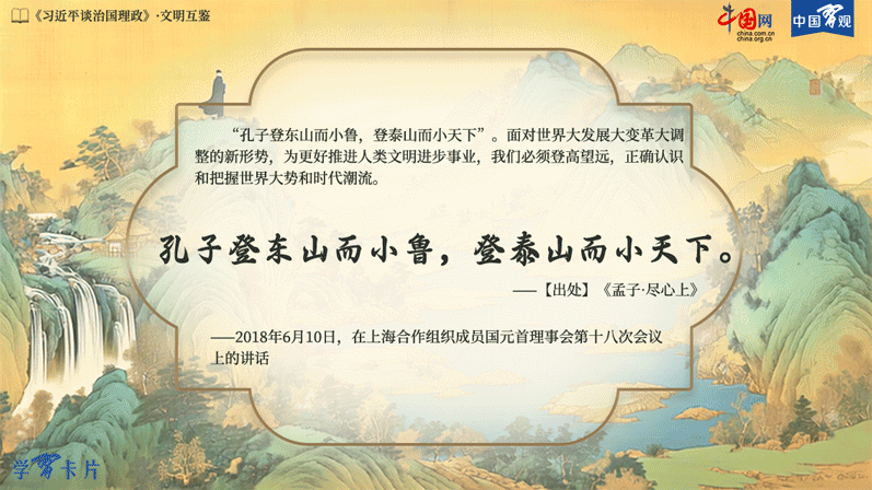 学习卡片 | 孔子登东山而小鲁,登泰山而小天下When Confucius looks down from the peak of the Dongshan Mountain, the local Kingdom of Lu comes into view; when he looks down from the peak of Mount Tai, the whole land comes into view.